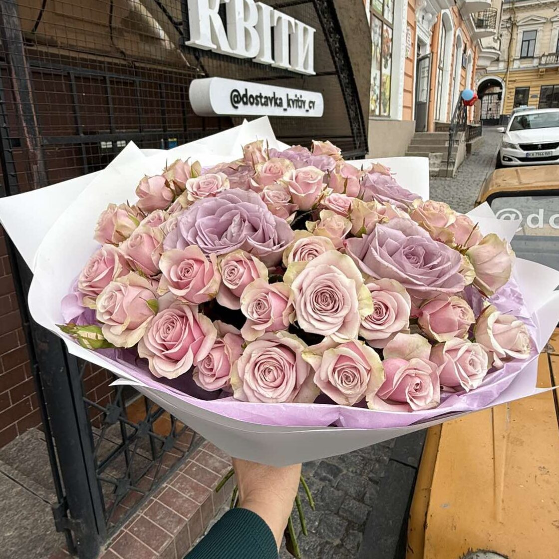 • Гармонійне поєднання квітів — рожеві та лавандові троянди створюють вражаючий візуальний ефект, який привертає погляди та викликає захоплення. Цей букет стане прикрасою будь-якого свята.