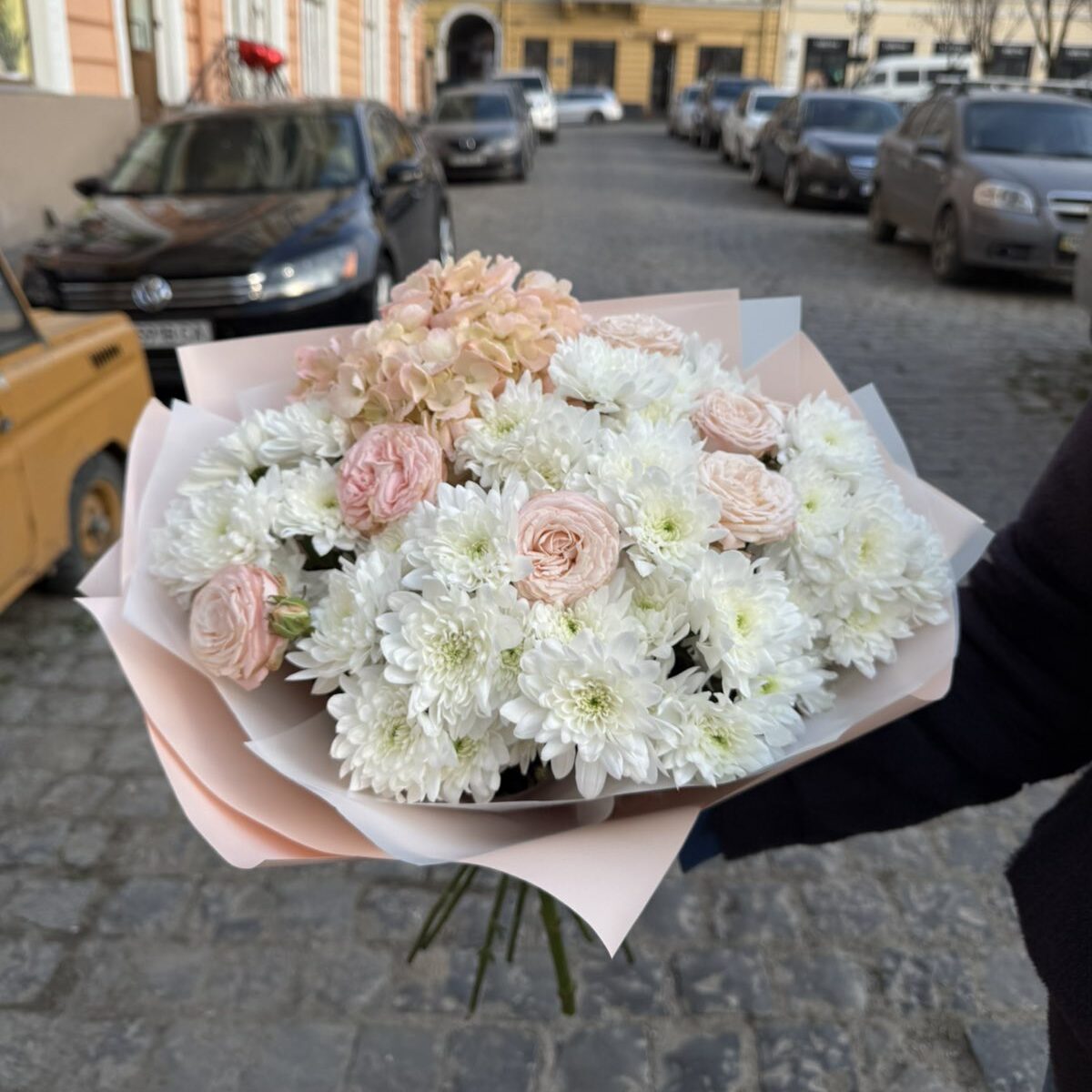 • Гармонійне поєднання квітів — білі хризантеми, піоновидні троянди та рожева гортензія створюють вражаючий візуальний ефект, який привертає погляди та викликає захоплення.