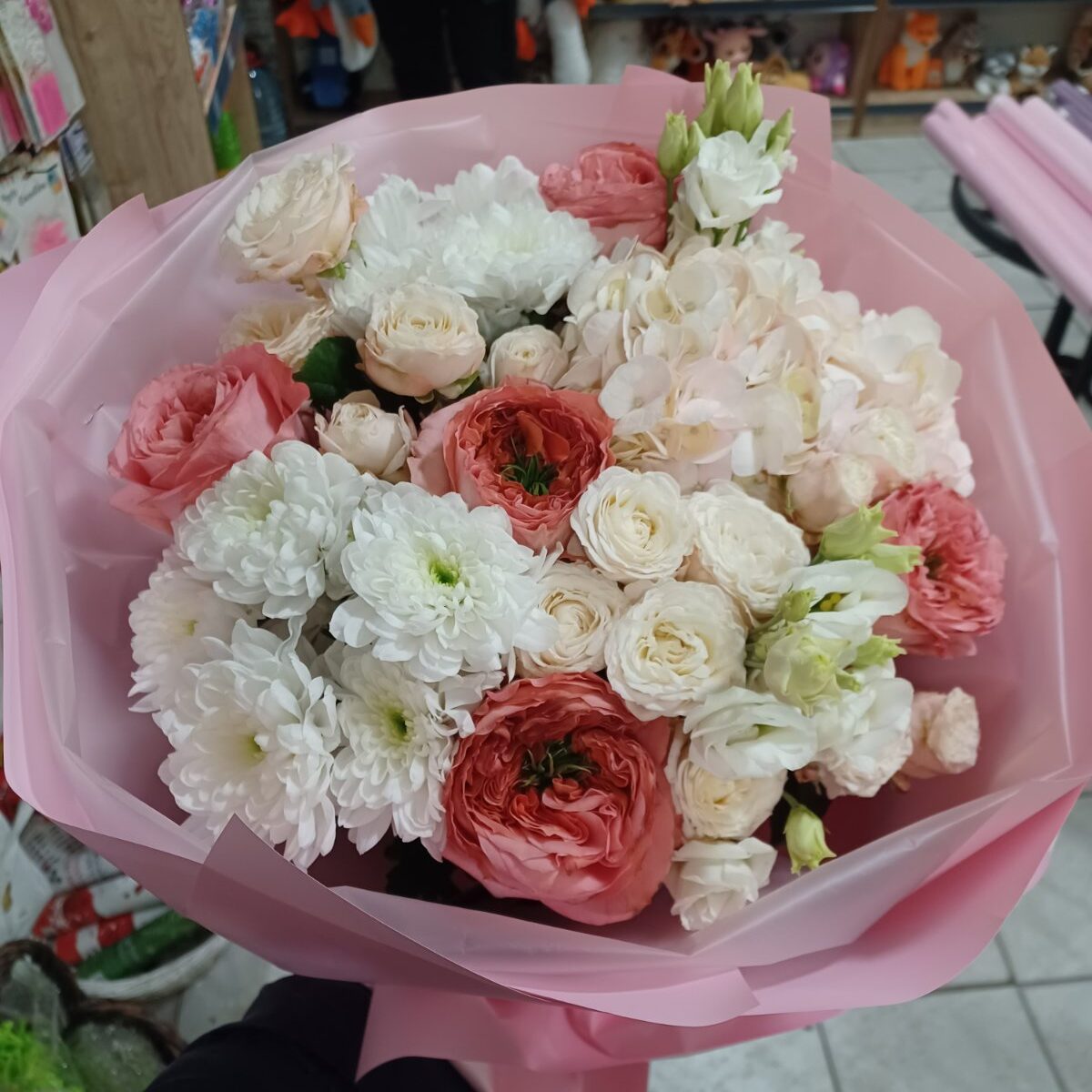 • Гармонійне поєднання квітів — рожева гортензія, білі хризантеми, біла еустома та рожеві піоновидні троянди створюють вражаючий візуальний ефект, який привертає погляди та викликає захоплення.