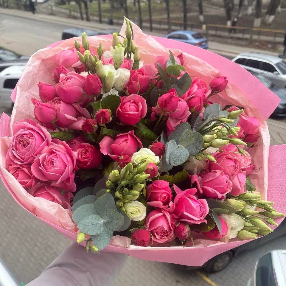 - — кущові троянди та еустома довго зберігають свіжість, радуючи вас та ваших близьких своєю красою.