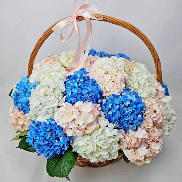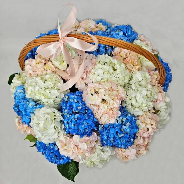 - Прикраса інтер’єру — корзина з гортензіями стане яскравою деталлю в будинку або офісі, додаючи затишку та краси.